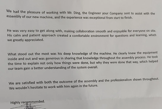 JonathanMr. Ding, your engineer, provided exceptional service during our machine assembly. His deep expertise and patient approach made collaboration smooth, while his clear explanations helped our team fully understand the system. We are thoroughly satisfied with both the results and his professionalism, and highly recommend his services.