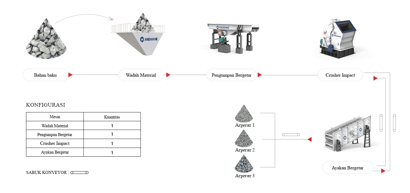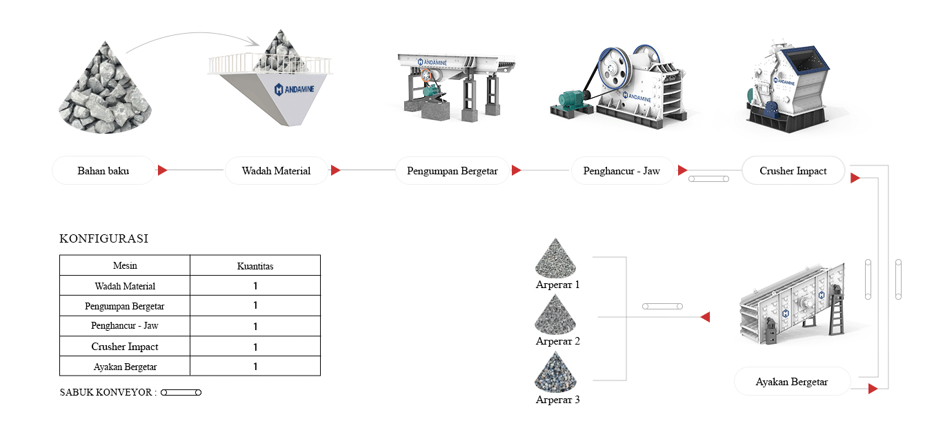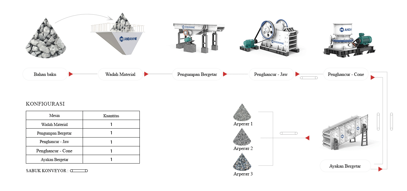 Konfigurasi: Pengumpan getaran, crusher cone, sabuk pengangkut, etc.